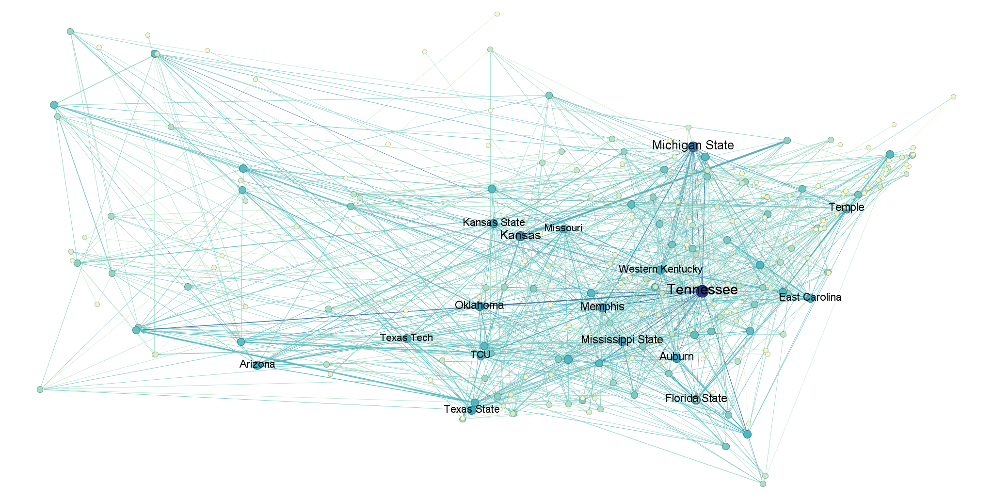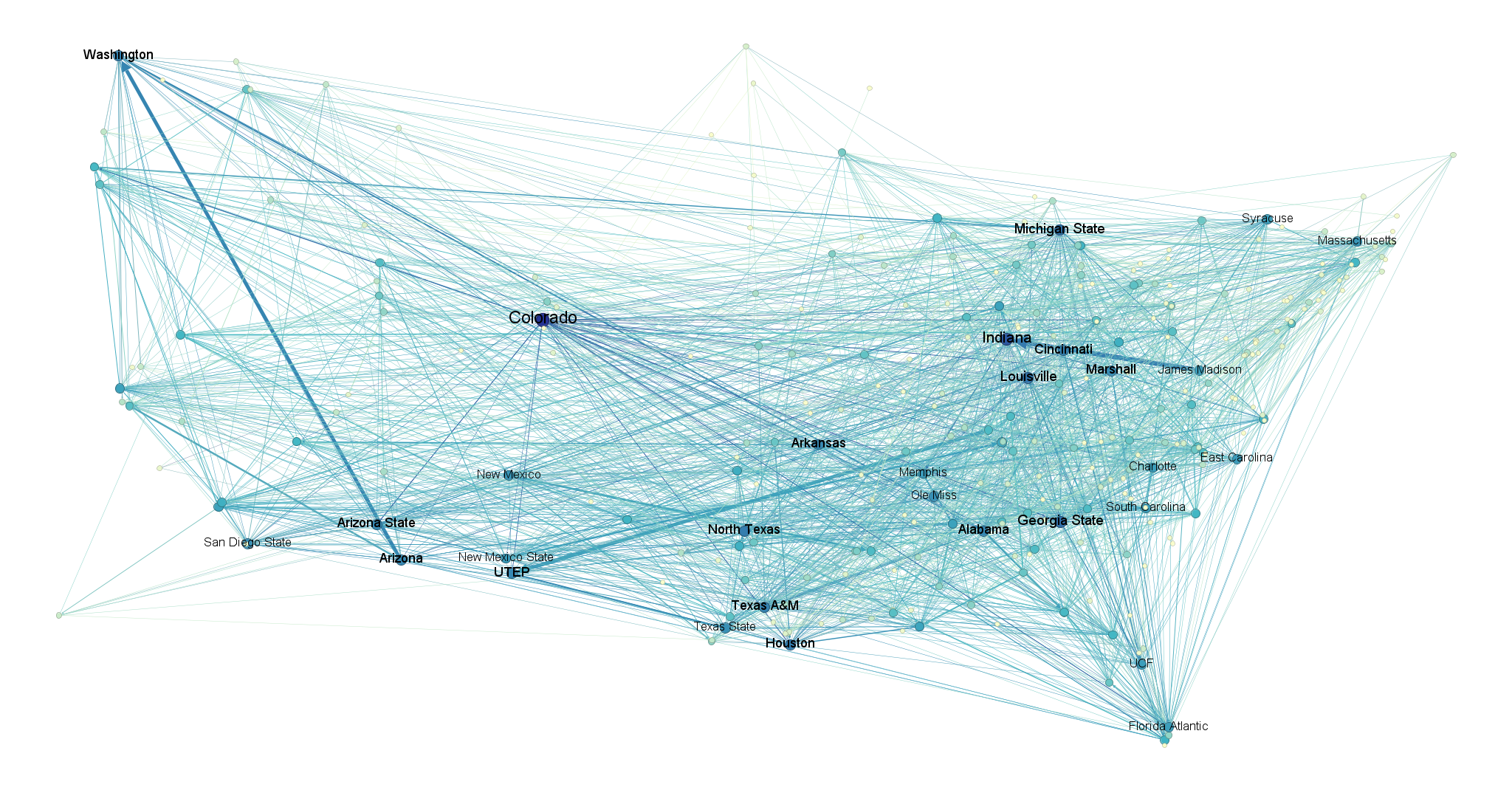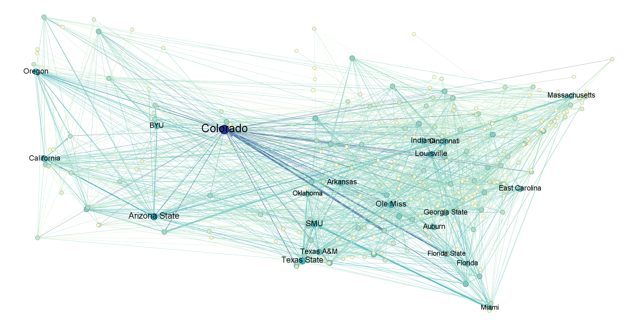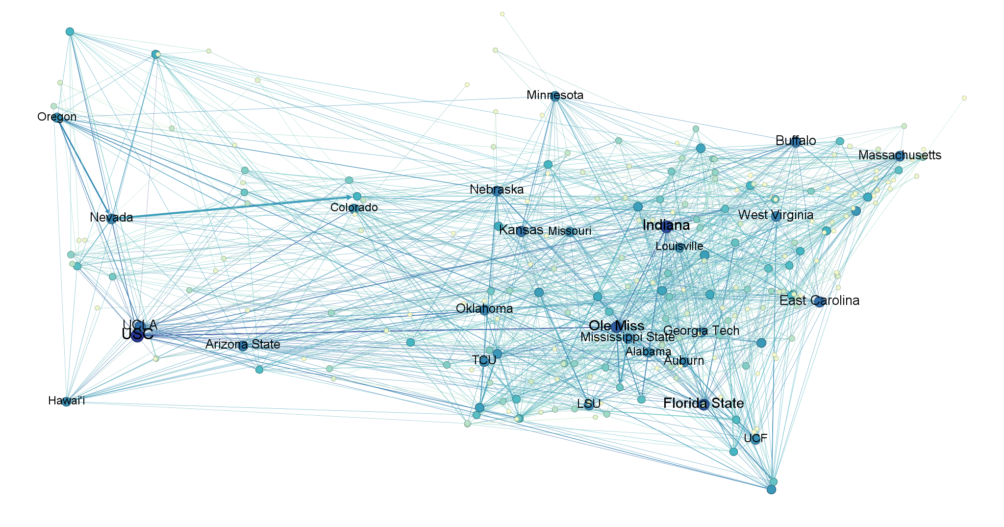 Looking at individual schools, we can see some interesting things as well. For instance, we can see that Iowa and Iowa State actually operate in entirely separate recruiting pipelines despite being less than 50 miles from eachother – likely owing both to their central location and long period of playing in separate conferences. We can also see that Army, Northwestern, and Arkansas State occupy “broker” positions in-between communities, where they have the seemingly rare privilege of recruiting from both.