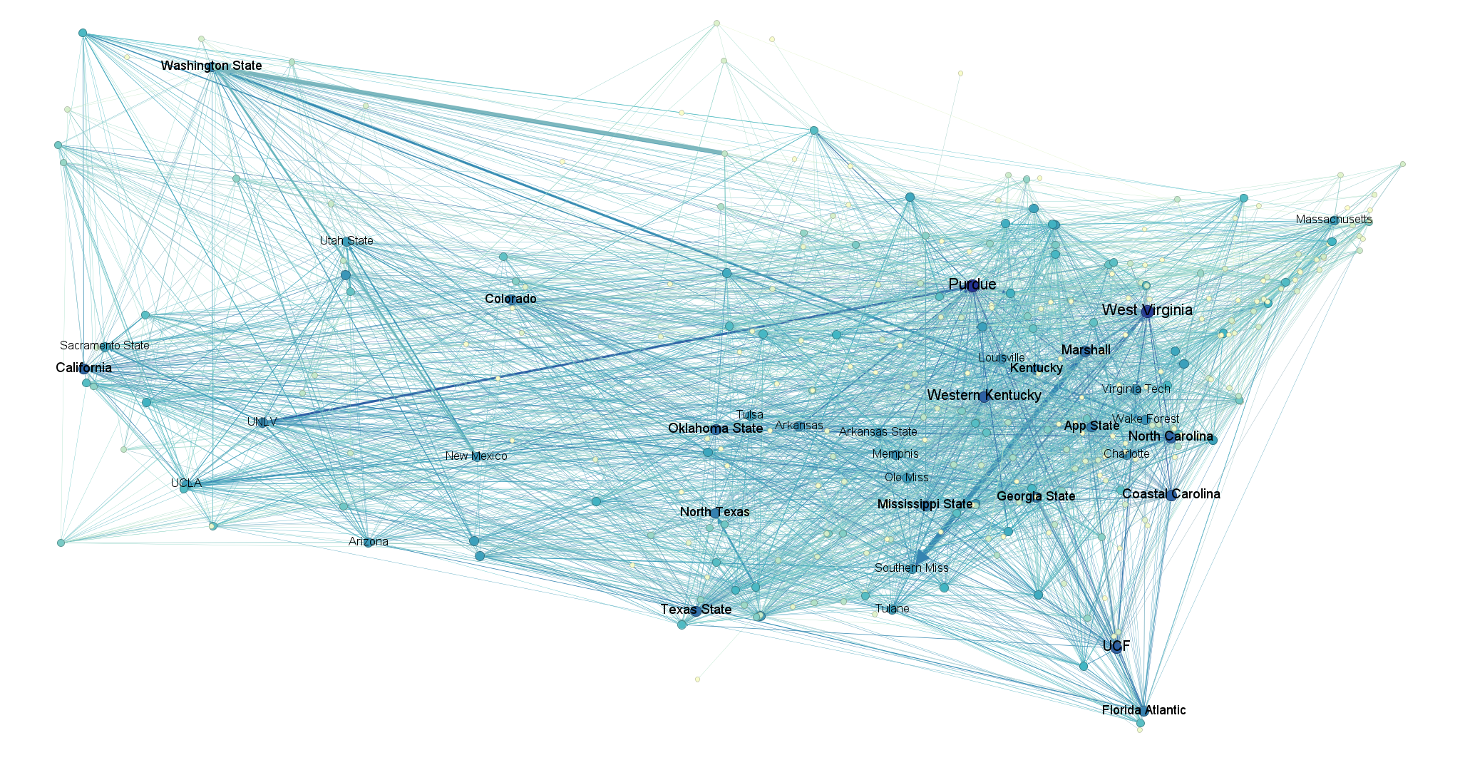 What’s more, even traditional recruiting can be represented as a network: a bipartite one, with schools on one side and recruit hometowns on the other. It can then be projected by school to identify shared recruiting grounds. In this case the usable data goes back much further (specifically to 2002). The recruiting network has some interesting findings, too – including one especially cool one – but we can save that for later. For now, we’ll just focus on the portal.