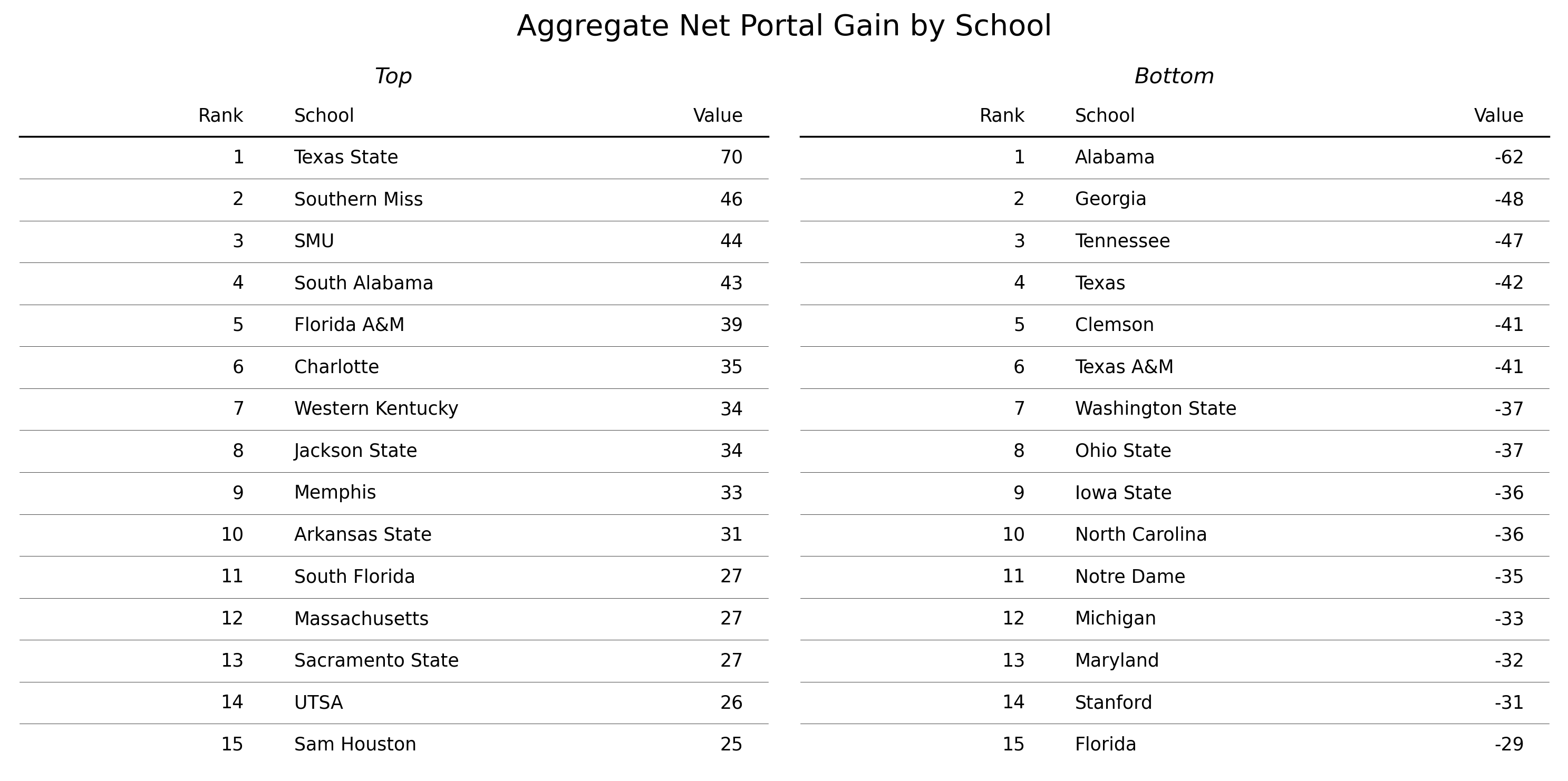 The bottom 15 is filled to the brim with blue-bloods, some of the most successful and prestigious programs of the past 25 years. These programs are being drained of players at an astounding rate. Meanwhile, the other side consists mainly of much-less-prestigious G6 schools which are happily profiting off the difference.