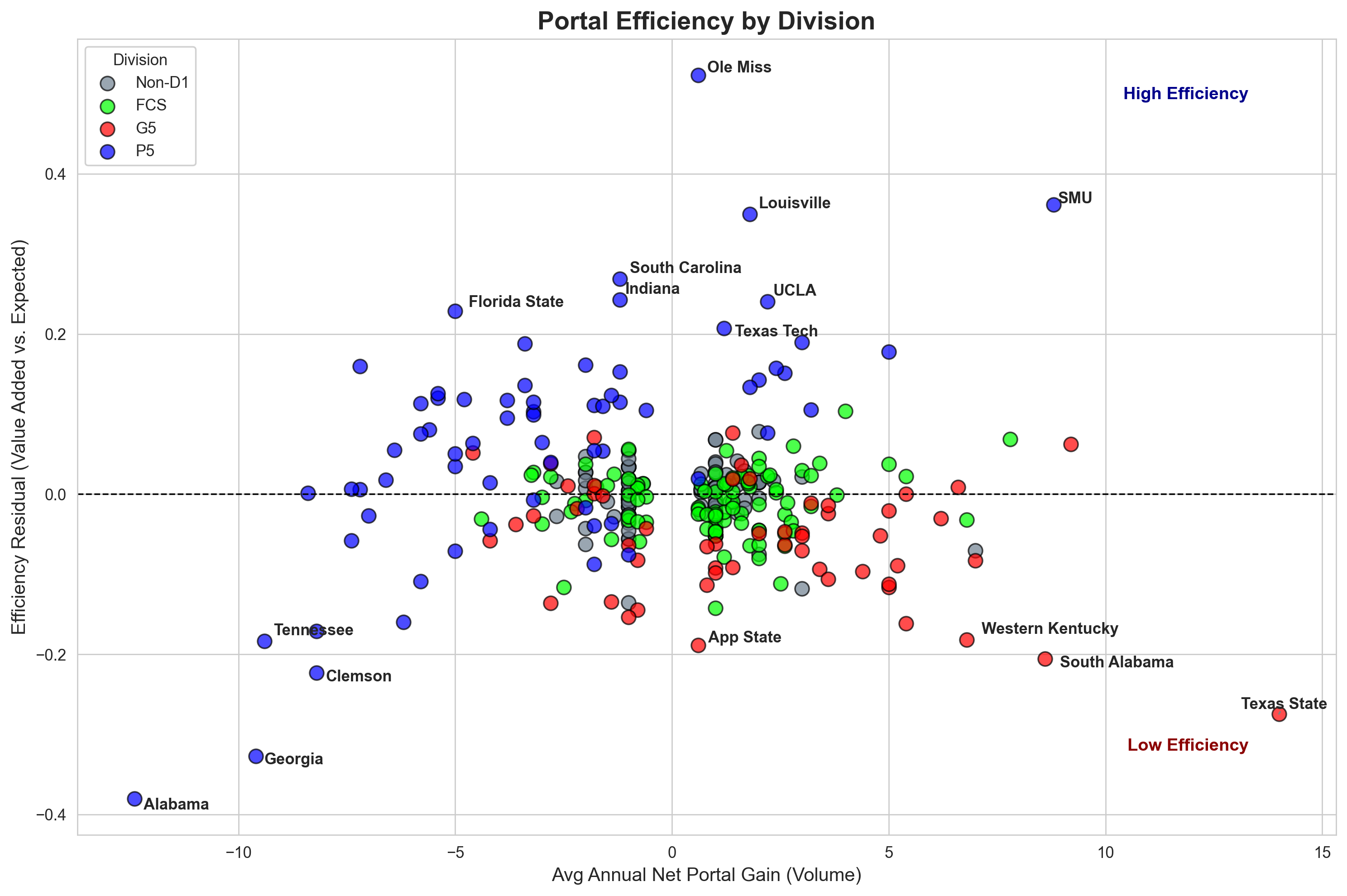 As you can see there are some schools, like Colorado and Ole Miss, that score highly on both metrics; these tend to be the programs with the most aggressive portal strategies over the past five seasons.