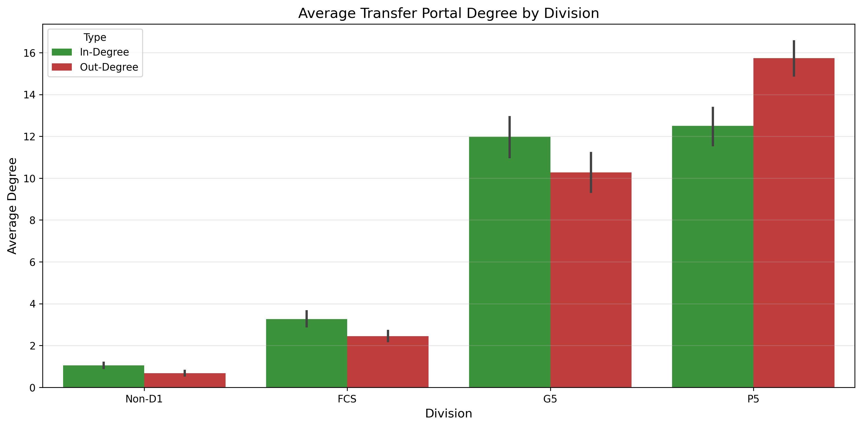 This hierarchical arrangement allows us to confirm our topology: core-periphery. High-activity FBS programs at the center act as central hubs for the entire network, and because these “core” schools engage in the portal at such a high rate, they effectively collapse the distance between any two programs in the system. For example, a player might move from a D3 school to a mid-tier FCS program, while another moves from that same FCS program to a P4; this creates a path that connects the fringes to the summit in just two steps.