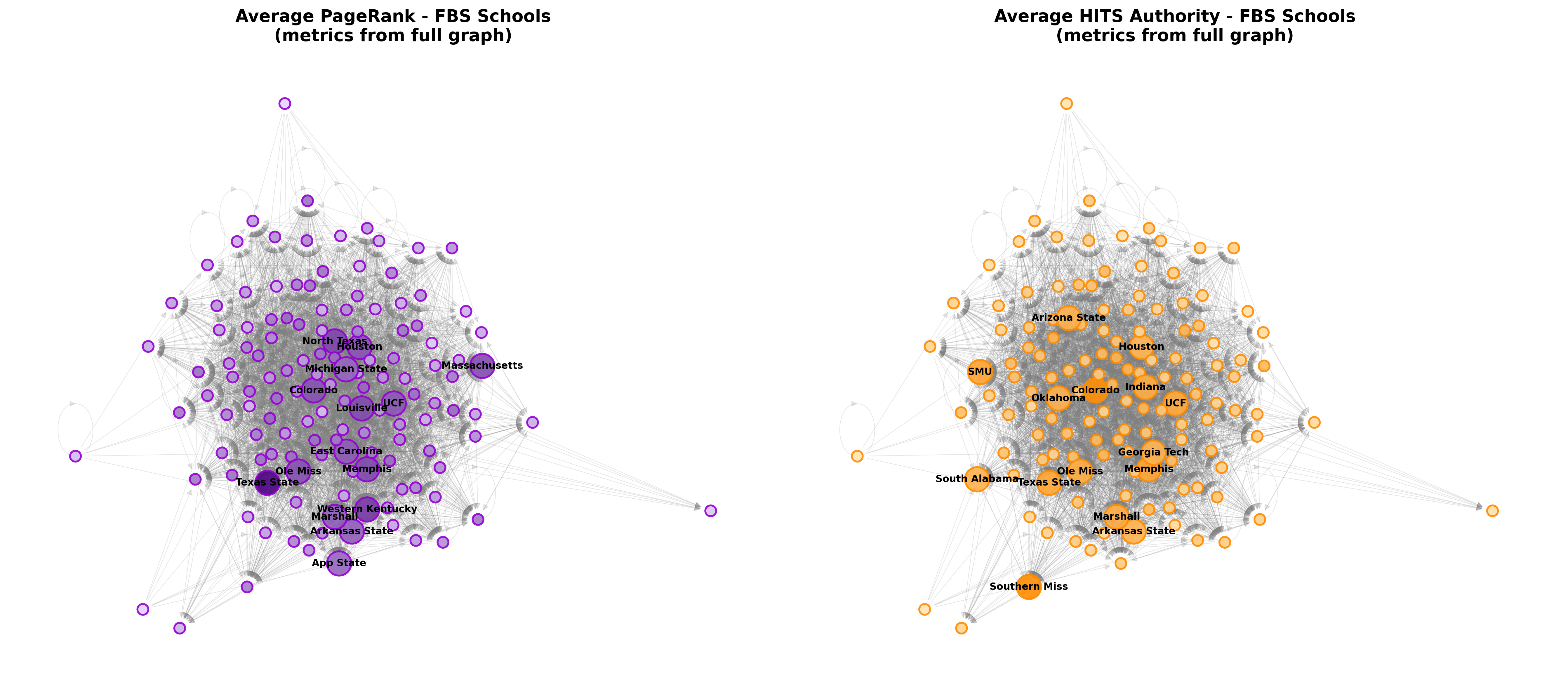 This is a visual representation of the top 15 schools by each metric, upscaled and labeled. Metrics are calculated from the full network, but the visualization algorithm was only run on the FBS subgraph to improve readability (and so that the script could finish running before the sun enters its red giant phase).
