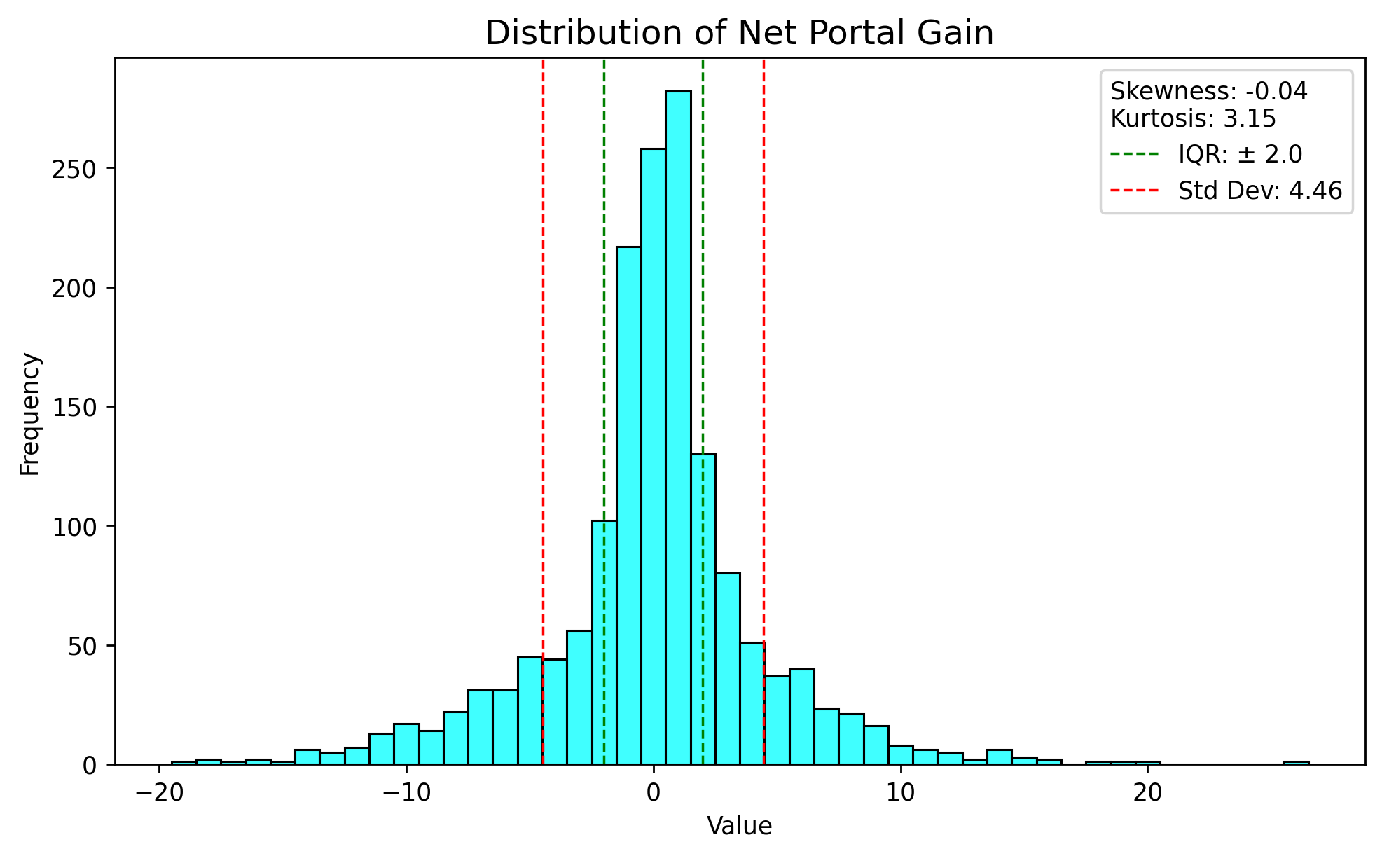 Since we are dealing with a directed network, we can take advantage of in-degree and out-degree (incoming vs outgoing transfers) to create two simple node-level metrics. We’ll call them “Net Portal Gain” and “Net Portal Value,” or NPG and NPV. NPG is just the net degree – the number of in-transfers minus out-transfers for a node – and NPV is the same but with player rating.