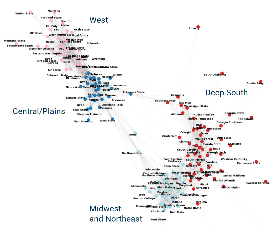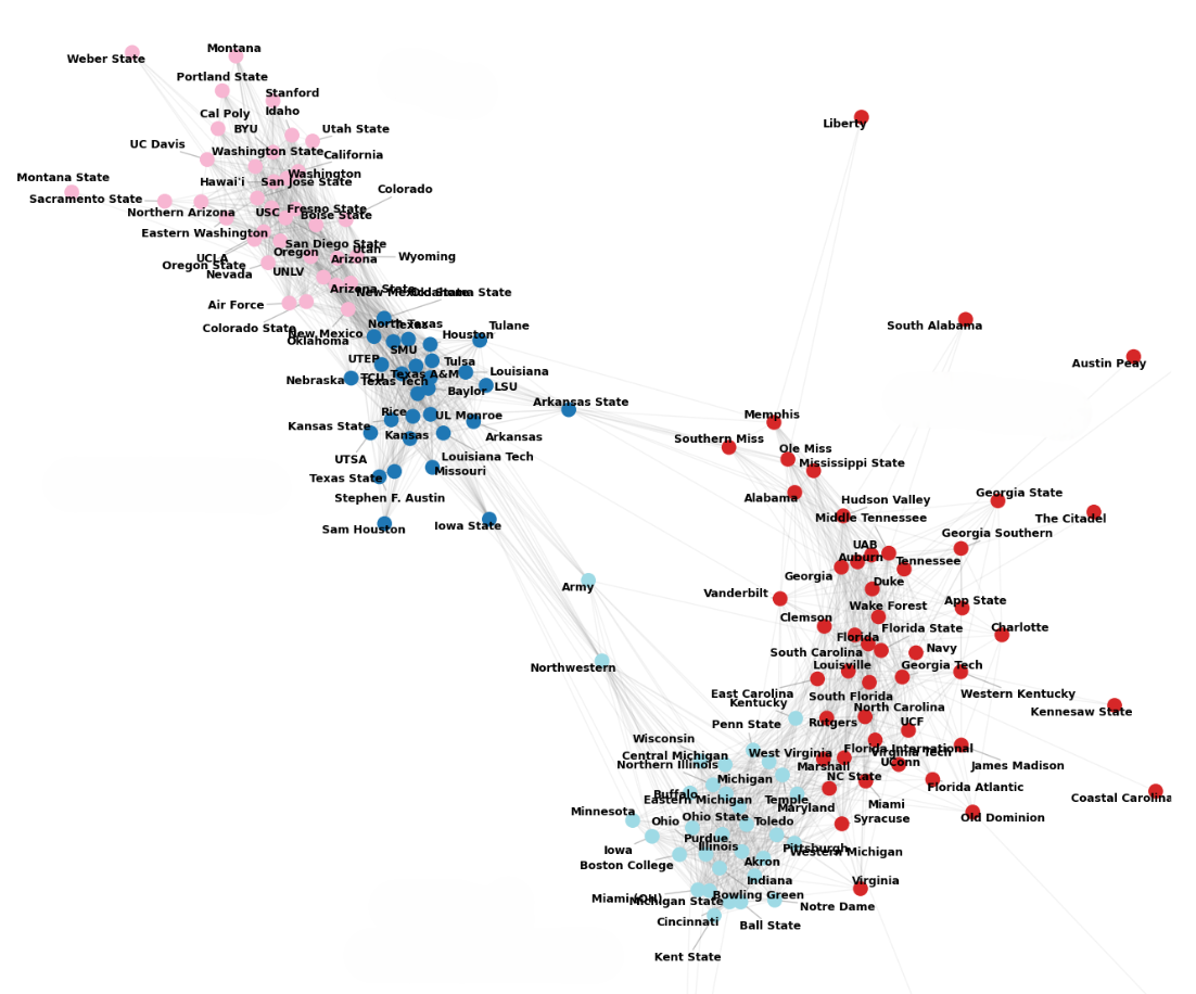 To find some clues, we can use the Fruchterman-Reingold algorithm – one of several “layout algorithms” used to visualize networks. It works by treating nodes as electrically-charged particles, pushing unconnected nodes apart and pulling connected ones together until an energy-minimizing “equilibrium” is reached. Applying this algorithm to our network and coloring the nodes by division (FBS blue, FCS green, lower divisions pink), we get this result:
