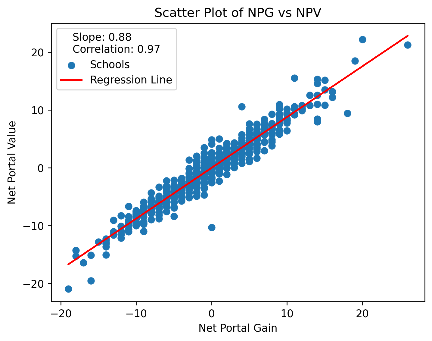This is a chart showing, on the x-axis, average NPG, and on the y-axis the difference between expected value added (based on their NPG) and the actual value they did add. Schools are colored by division and the top/bottom 8 are labeled. Interestingly, it seems to be stratified mostly within-FBS; P4 schools are generally getting more “bang for their buck” while G6 are getting less.