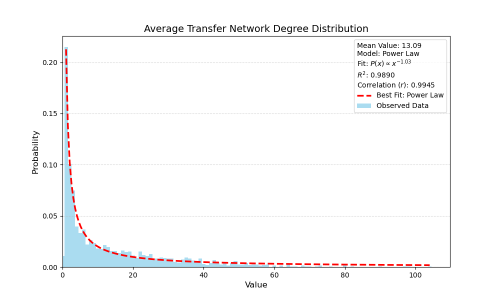 And here is their average weighted-degree distribution, which follows a power law with scaling exponent 1.03. This indicates a “heavy-tailed” distribution where the vast majority of programs have very few transfers, but a small number of high-activity ones engage in the portal at a much higher rate than average.